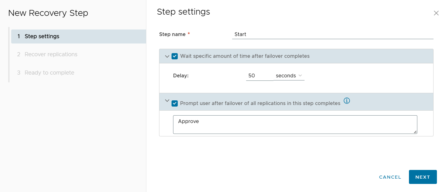 9. При необходимости отметьте чекбокс напротив Prompt user after failover of all replications in this step completes и задайте сообщение. Эта настройка шага позволяет выводить сообщение с подсказкой пользователю, приостанавливая выполнение текущего шага перед выполнением следующего шага, пока не будет одобрена подсказка на текущем шаге. Рекомендуем использовать только при необходимости ручной проверки после завершения шага, так как наверняка приведёт к увеличению времени аварийного восстановления.