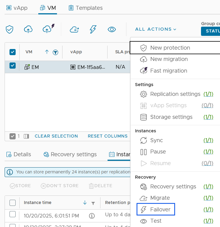 4. Отметьте checkbox напротив нужной ВМ, нажмите All actions выберите Failover.