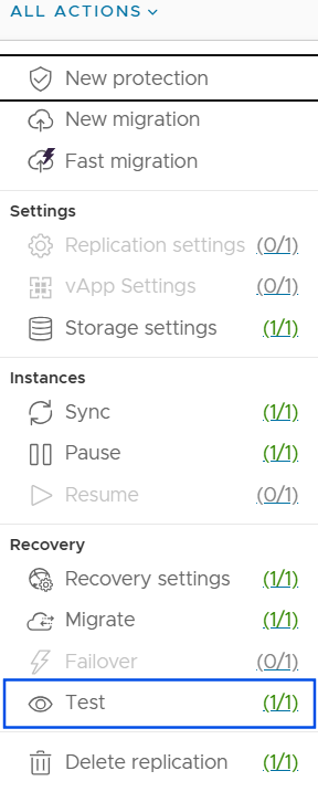 - После завершения проверок удалите тестовую ВМ, для этого в разделе Incoming replication выберите тестируемую ВМ или vApp, нажмите All Actions, а далее Test Cleanup