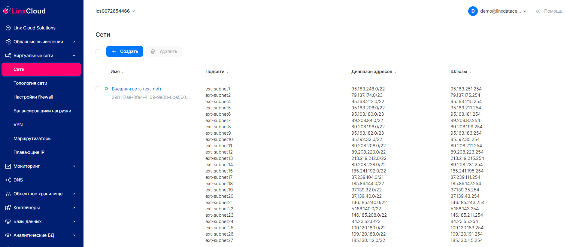 Для создания подсети необходимо предварительно выбрать сеть из списка созданных сетей в разделе «Виртуальные сети» Личного кабинета Linx Cloud.